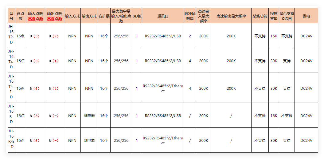 16點主機,8DI(NPN)/8DO(NPN),其中:6點最大200K高速輸入(X0-X53路AB),4點最大200k高速輸出(出廠默認最高頻率為100k),驅動電機4軸。支持C語言,程序容量30K